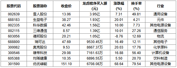 6月5日龙虎榜出炉,雪人股份、生益电子、科华数据为当日龙虎榜净买入额前三,分别为3.95亿元、1.93亿元、1.56亿元。