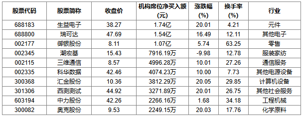 龙虎榜中涉及机构专用席位的个股中,当日净买入额前三为生益电子、瑞可达、御银股份,分别为1.74亿元、1.54亿元、1.07亿元。
